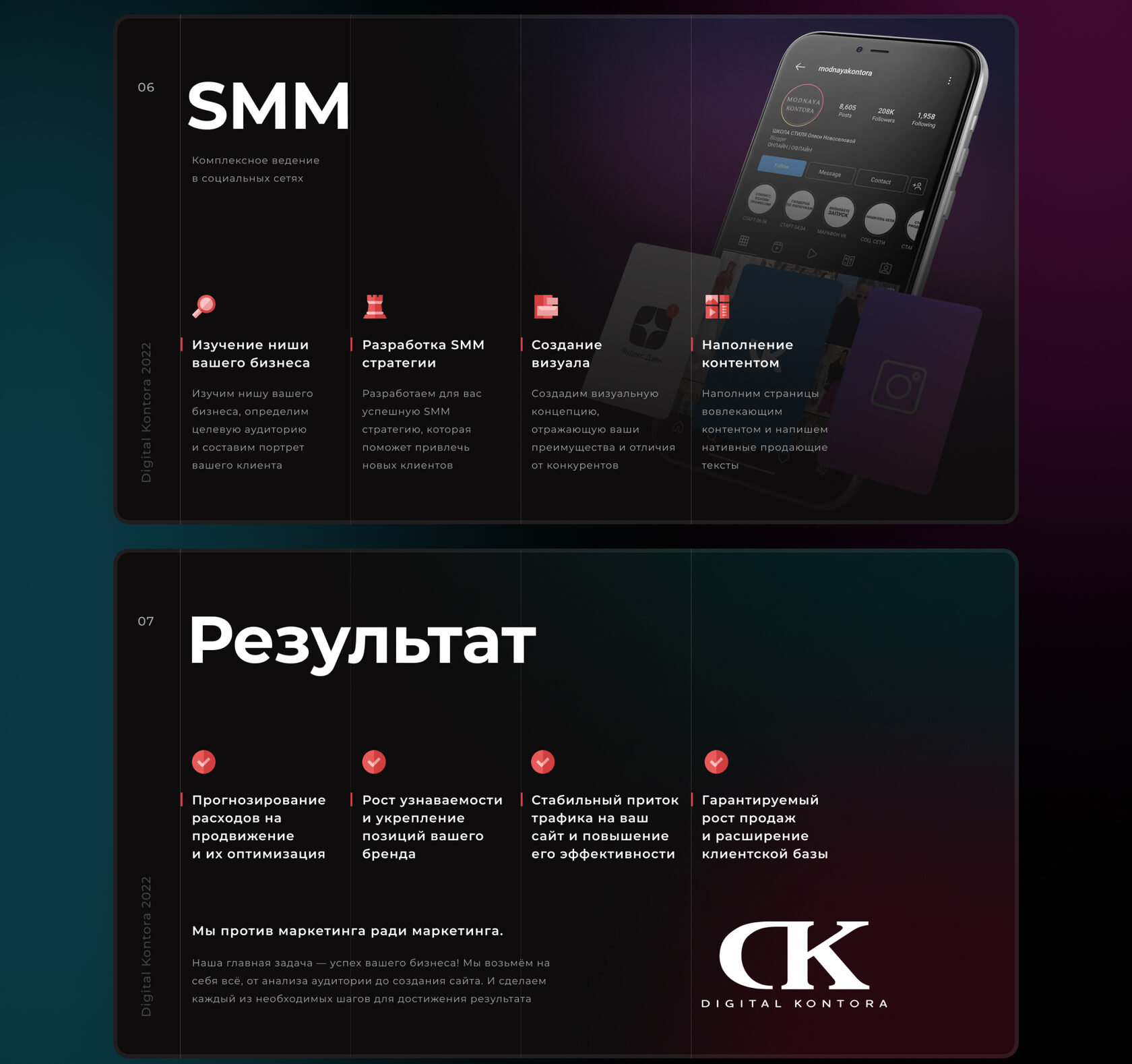Мы предлагаем полный спектр услуг для создания контента и упаковки бренда, включая дизайн, вёрстку, SEO, фотографию, видеосъемку, видеомонтаж, копирайтинг и больше, чтобы помочь вам достичь успеха и раскрыть потенциал вашего бренда.